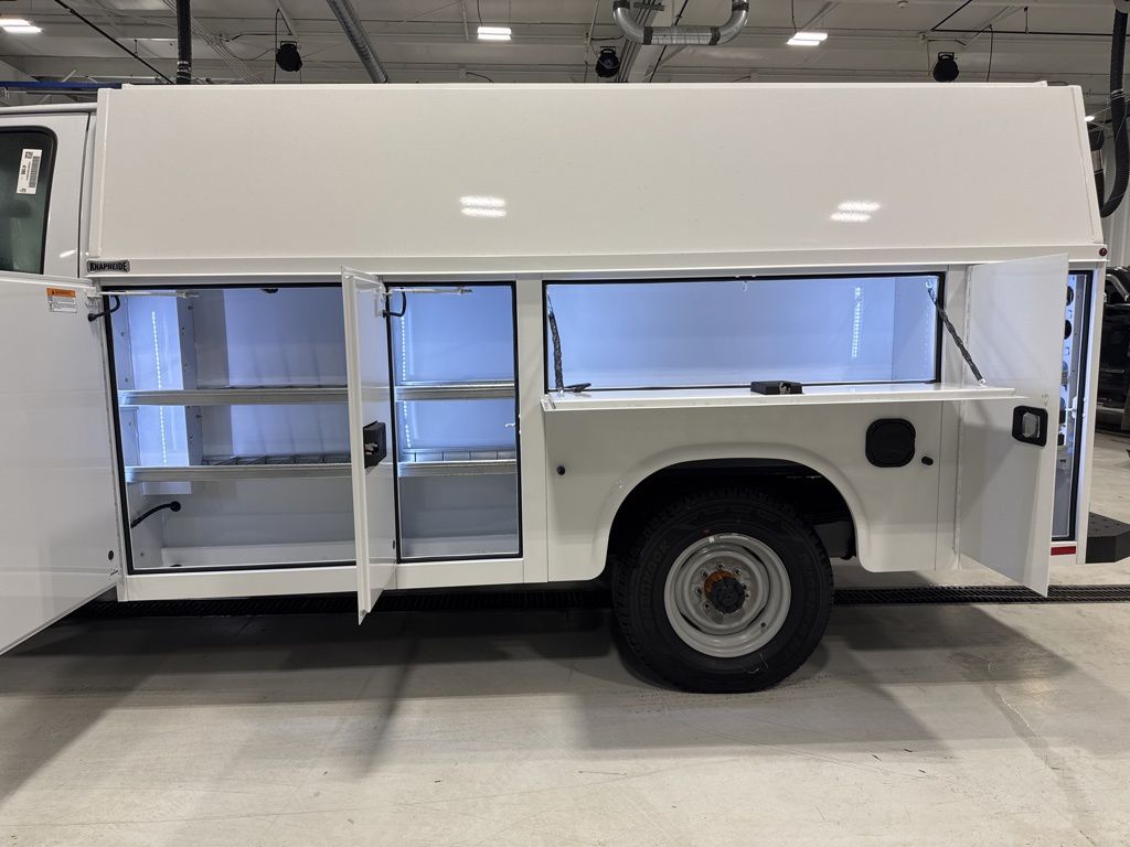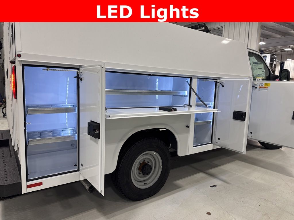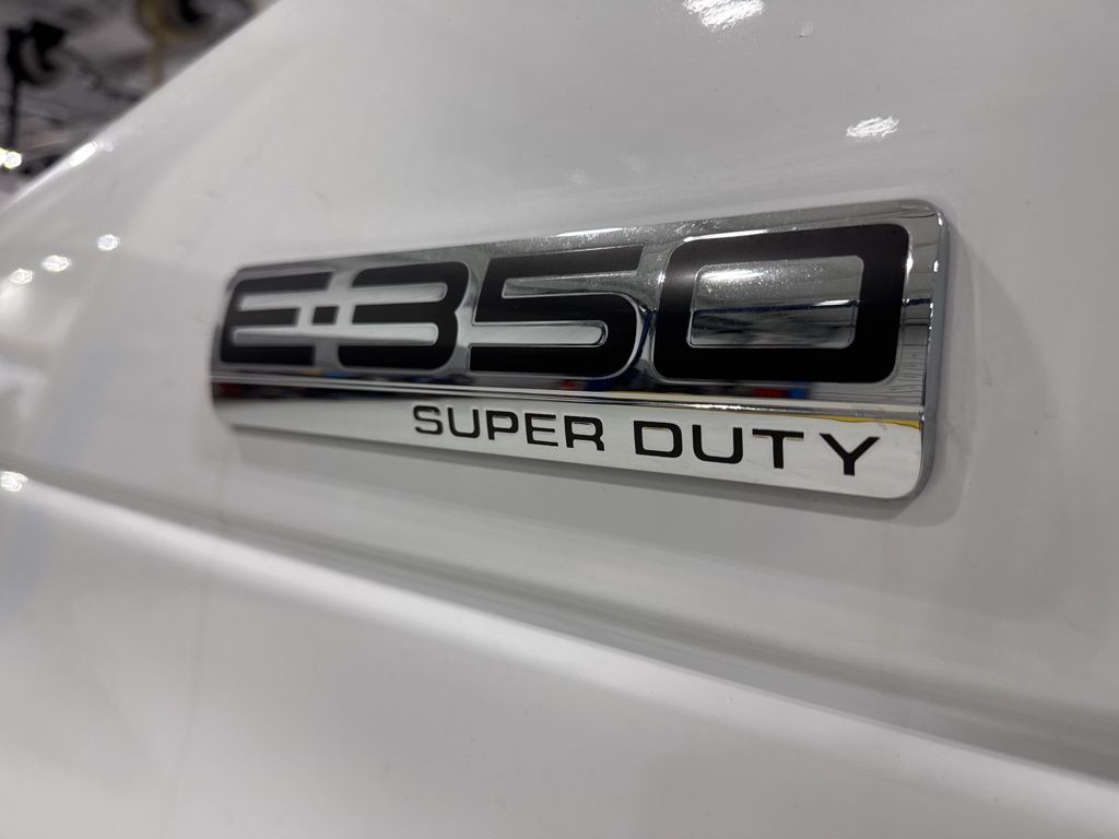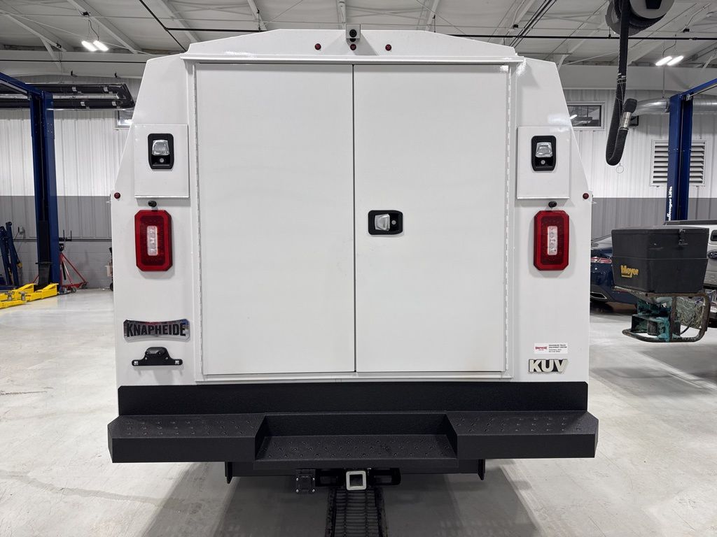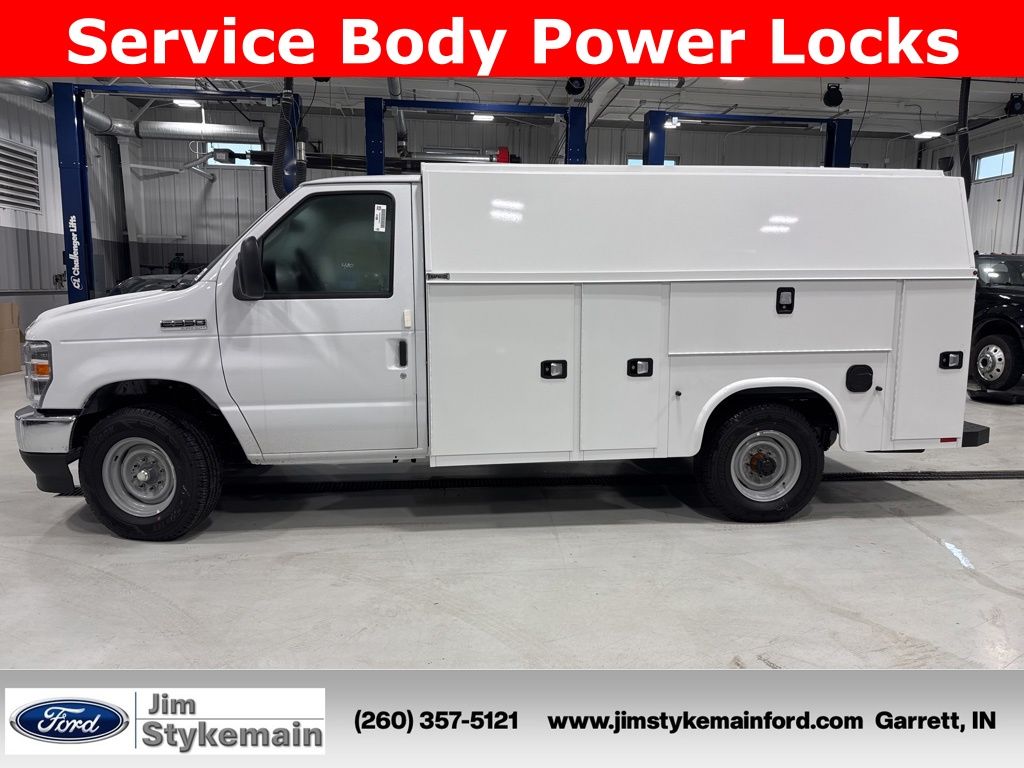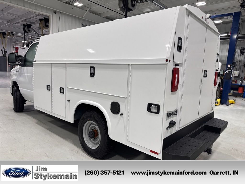 Oxford White 2026 Ford E-350SD Cutaway RWD 6-Speed Automatic with Overdrive 7.3L V8 KUV129SU Body with Ultra Low Roof Automotive Style Rivet-less Rotary Latches Automotive Door Seals Weight Reduced Galvanneal Corrigated Steel Floor Standard Shelving Package ABS Cab Partition with Sliding Door and Window Rear Access Door, Both Rear End Panels Underlap Rear Door Inside Release Handle Galva-Grip Bumper with Step Well and Knapliner LED Surface Mount Lights with Rear Strobe Lights Activated Master Locking System Aluminum Fuel Fill Solid Rear Doors Grab Handle Located at Right Rear Two Dome Lights Switched at Rear Factory Supplied Backup Camera Installed K-Coat Corrosion Protection with Knapheide's Exclusive 12-Stage Electro-Coating Prime Paint System Body Fully Undercoated Finish Painted White (Single Stage Enamel) Exterior, Cargo Area, Class V Receiver Hitch with 2-1/2" Receiver Tube Rated at 12,000lb Maximum Trailer Weight 2,400lb Maximum Tongue Weight, Knapheide Power Locks in lieu of Master Locks, LED Compartment Lights, Electric Brake Controller, KUV Ultra Low Roof, 7.3L V8, Oxford White, 110V Power Inverter, 2 Speakers, 240 Amp Alternator, 4-Wheel Disc Brakes, Air Conditioning, AM/FM radio, Chrome Grille, Cruise Control, Driver's Seat Mounted Armrest, Dual front impact airbags, Dual High Back Buckets, Electronic Stability Control, Engine Block Heater, Front anti-roll bar, Front Chrome Bumper, High Series Exterior Upgrade Package, Power Equipment Group, Power steering, Rear View Camera Kit, Remote Keyless Entry, Telescoping steering wheel, Tilt steering wheel, Traction control, User-Defined Switches, Voltmeter.
