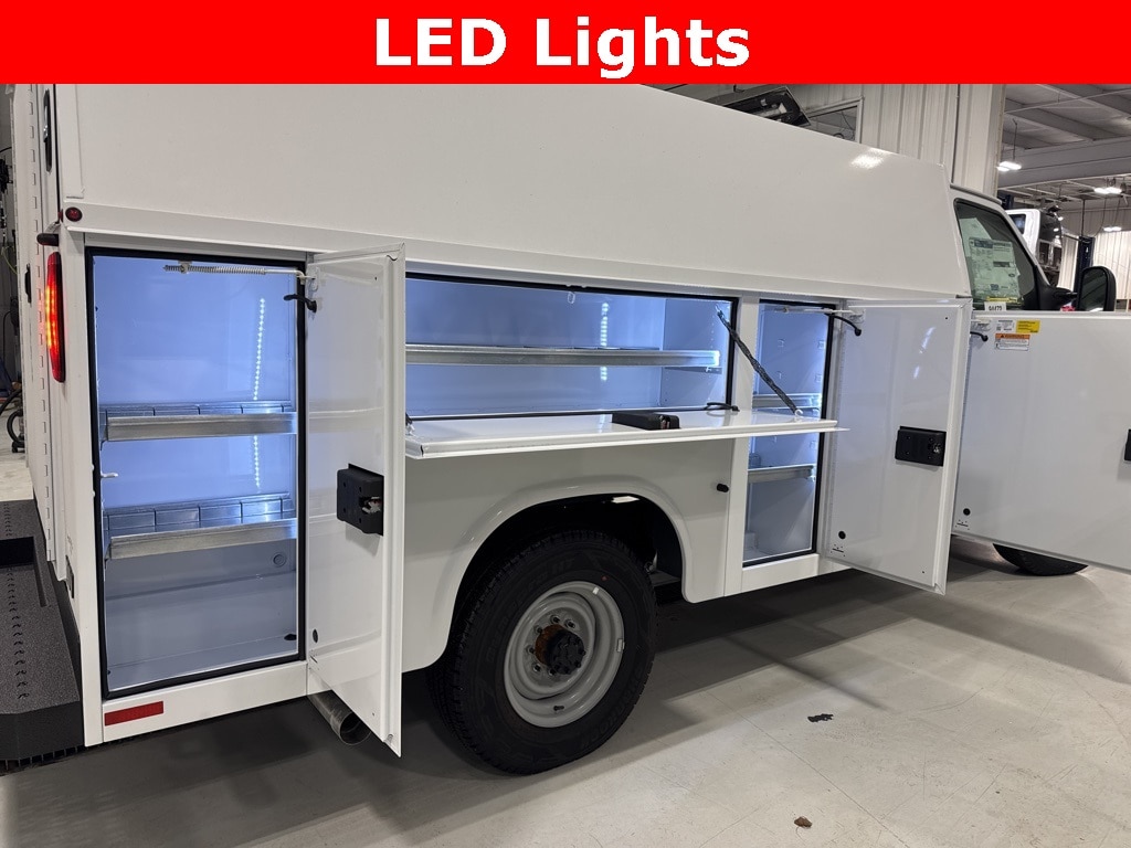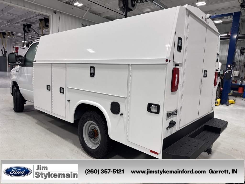 Oxford White 2026 Ford E-350SD Cutaway RWD 6-Speed Automatic with Overdrive 7.3L V8 KUV129SU Body with Ultra Low Roof Automotive Style Rivet-less Rotary Latches Automotive Door Seals Weight Reduced Galvanneal Corrigated Steel Floor Standard Shelving Package ABS Cab Partition with Sliding Door and Window Rear Access Door, Both Rear End Panels Underlap Rear Door Inside Release Handle Galva-Grip Bumper with Step Well and Knapliner LED Surface Mount Lights with Rear Strobe Lights Activated Master Locking System Aluminum Fuel Fill Solid Rear Doors Grab Handle Located at Right Rear Two Dome Lights Switched at Rear Factory Supplied Backup Camera Installed K-Coat Corrosion Protection with Knapheide's Exclusive 12-Stage Electro-Coating Prime Paint System Body Fully Undercoated Finish Painted White (Single Stage Enamel) Exterior, Cargo Area, Class V Receiver Hitch with 2-1/2" Receiver Tube Rated at 12,000lb Maximum Trailer Weight 2,400lb Maximum Tongue Weight, Knapheide Power Locks in lieu of Master Locks, LED Compartment Lights, Electric Brake Controller, KUV Ultra Low Roof, 7.3L V8, Oxford White, 110V Power Inverter, 2 Speakers, 240 Amp Alternator, 4-Wheel Disc Brakes, Air Conditioning, AM/FM radio, Chrome Grille, Class I Trailer Towing Package, Cruise Control, Driver's Seat Mounted Armrest, Dual front impact airbags, Dual High Back Buckets, Electronic Stability Control, Engine Block Heater, Front anti-roll bar, Front Chrome Bumper, High Series Exterior Upgrade Package, Power Equipment Group, Power steering, Radio: AM/FM Stereo w/Clock Display & 2 Speakers, Rear View Camera Kit, Remote Keyless Entry, SecuriLock Passive Anti-Theft System (ePATS), Telescoping steering wheel, Tilt steering wheel, Traction control, User-Defined Switches, Voltmeter.