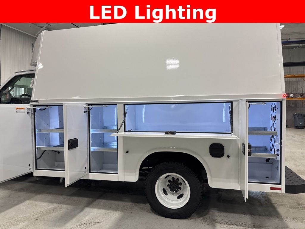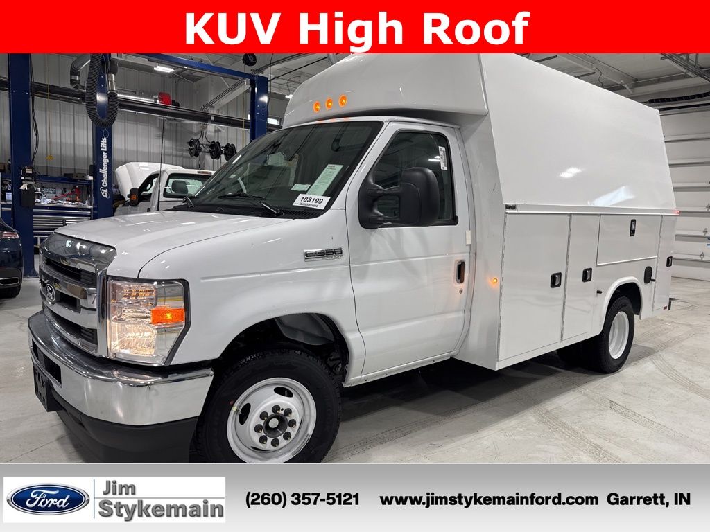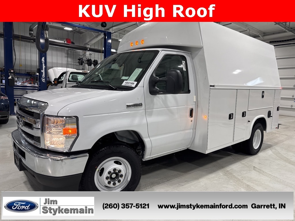 Oxford White 2026 Ford E-350SD Cutaway RWD 6-Speed Automatic with Overdrive 7.3L V8 * USB ADAPTER *, * BLUETOOTH *, *Call 260-357-5121*, KUV153D20H Body with High Roof Automotive Style Rivet-less Rotary Latches Automotive Door Seals Weight Reduced Galvanneal Corrigated Steel Floor Standard Shelving Package ABS Cab Partition with Sliding Door and Window Rear Access Door, Both Rear End Panels Underlap Rear Door Inside Release Handle Galva-Grip Bumper with Step Well and Knapliner LED Surface Mount Lights with Rear Strobe Lights Activated Master Locking System Aluminum Fuel Fill Solid Rear Doors Grab Handle Located at Right Rear Two Dome Lights Switched at Rear Factory Supplied Backup Camera Installed Wind Deflector Included K-Coat Corrosion Protection with Knapheide's Exclusive 12-Stage Electro-Coating Prime Paint System Body Fully Undercoated Finish Painted White (Single Stage Enamel) Exterior, Cargo Area, Class V Receiver Hitch with 2-1/2" Receiver Tube Rated at 12,000lb Maximum Trailer Weight, Knapheide Power Locks in lieu of Master Locks, LED Compartment Lights, Electric Brake Controller, KUV High Roof, 7.3L V8, Oxford White, 110V Power Inverter, 4-Wheel Disc Brakes, Air Conditioning, AM/FM radio, Chrome Grille, Class I Trailer Towing Package, Cruise Control, Driver's Seat Mounted Armrest, Dual front impact airbags, Electronic Stability Control, Front Black Vinyl Floor Covering, Front Bucket Seats, Front Chrome Bumper, Front wheel independent suspension, GVWR: 11,500 lb Payload Package, High Series Exterior Upgrade Package, Order Code 780A, Power Equipment Group, Power steering, Radio: AM/FM Stereo w/Clock Display & 2 Speakers, Rear View Camera Kit, Remote Keyless Entry, SecuriLock Passive Anti-Theft System (ePATS), Telescoping steering wheel, Traction control, User-Defined Switches, Variably intermittent wipers, Voltmeter.