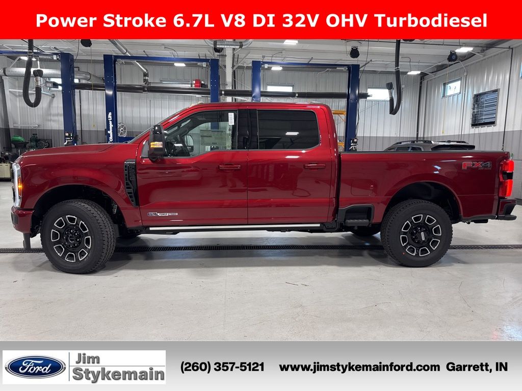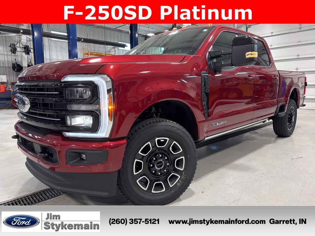 Ruby Red Metallic Tinted Clearcoat 2026 Ford F-250SD Platinum Sunroof FX4 Off Road 4WD 10-Speed Automatic Power Stroke 6.7L V8 DI 32V OHV Turbodiesel * Apple CarPlay/Android Auto *, * USB ADAPTER *, * BLUETOOTH *, * NAVIGATION GPS NAV *, * LEATHER *, * HEATED AND COOLED SEATS *, * KEYLESS START *, * SUNROOF *, * DIESEL *, * REMOTE ENGINE START *, * 4WD *, *Call 260-357-5121*, F-250SD Platinum Sunroof FX4 Off Road, 4D Crew Cab, Power Stroke 6.7L V8 DI 32V OHV Turbodiesel, 4WD, Ruby Red Metallic Tinted Clearcoat, 4-Wheel Disc Brakes, 5th Wheel/Gooseneck Hitch Prep Package, ABS brakes, Adjustable pedals, Air Conditioning, Alloy wheels, AM/FM radio: SiriusXM with 360L, Auto High-beam Headlights, Automatic temperature control, Compass, Dual front side impact airbags, Electronic Stability Control, Emergency communication system: SYNC 4 911 Assist, Flow-Through Console, Ford Connectivity Package (1-Year Included), Front dual zone A/C, Front fog lights, Fully automatic headlights, FX4 Off-Road Package, Garage door transmitter, Head-Up Display, Heated door mirrors, Heated front seats, Heated rear seats, Hill Descent Control, Illuminated entry, Internet access capable: 5G Modem - Ford Connectivity Package, Low tire pressure warning, Memory seat, Navigation system: Connected Navigation, Off-Road Specifically Tuned Shock Absorbers, Outside temperature display, Power driver seat, Power steering, Rain sensing wipers, Rear reading lights, Rear window defroster, Remote keyless entry, Split folding rear seat, Steering wheel mounted audio controls, Tachometer, Traction control, Trip computer, Twin Panel Power Moonroof, Unique FX4 Off-Road Box Decal, Variably intermittent wipers, Ventilated front seats.