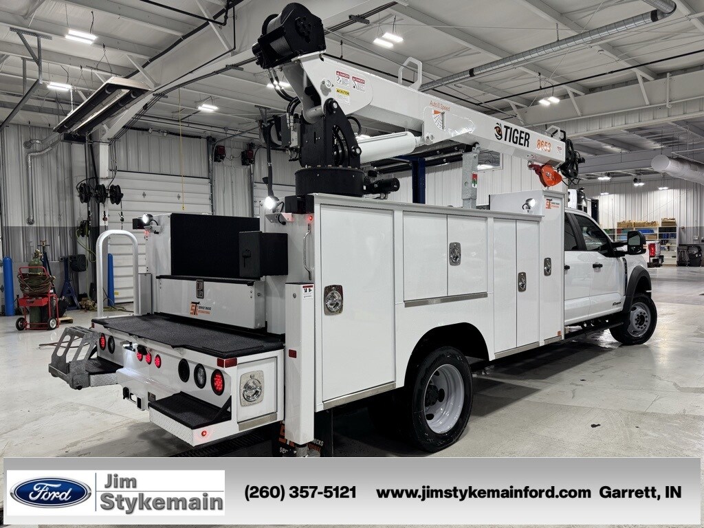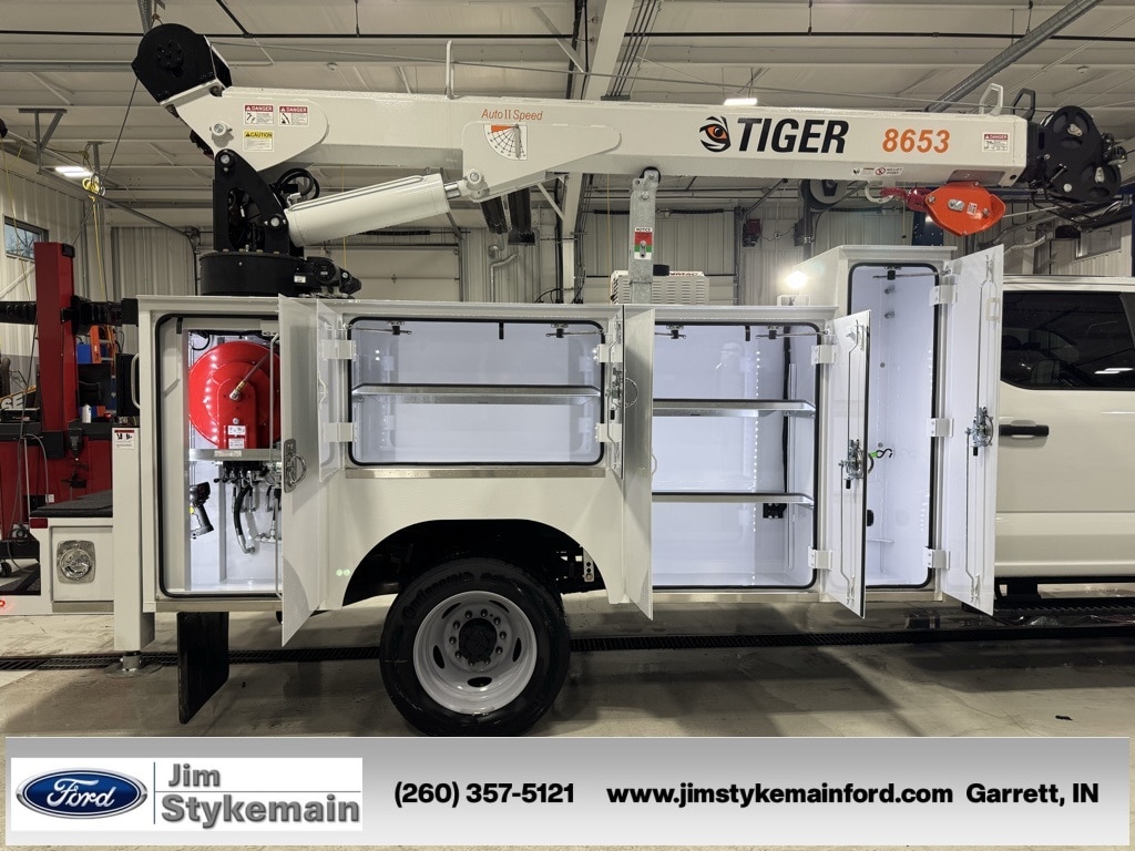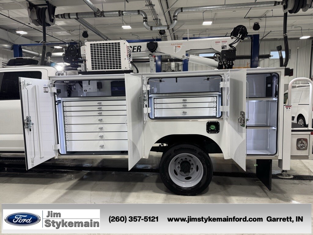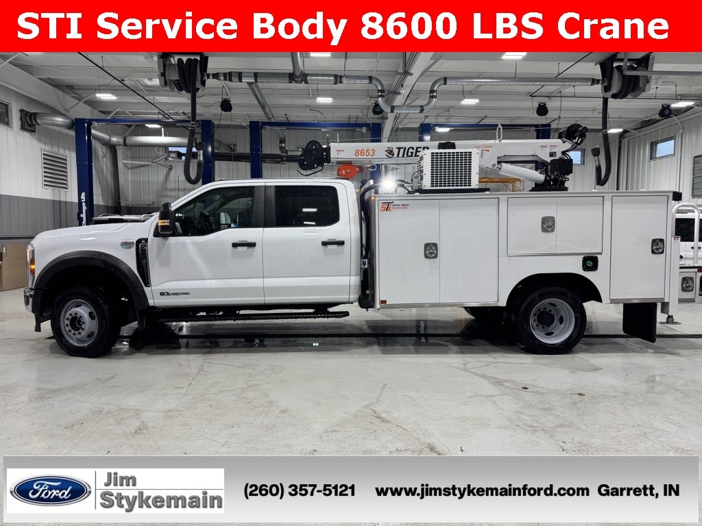 Oxford White 2026 Ford F-550SD XL CrewCab STI Service Body 8600 LBS Crane 4WD 10-Speed Automatic Power Stroke 6.7L V8 DI 32V OHV Turbodiesel * Apple CarPlay/Android Auto *, * USB ADAPTER *, * BLUETOOTH *, * DIESEL *, * REMOTE ENGINE START *, * 4WD *, *Call 260-357-5121*, Model 8653 TIGER Hydraulic crane. 50k ft lb crane moment rating, 8,600 lbs capacity, 30.5' of hyd reach, 68 FPM no load single line winch speed, Auto II speed, Wireless joystick control with proportional trigger and LCD load display, Integrated filtration with visual bypass alert, 400 degree rotation, Anti-two-block, overload protection, notification horn and 33 ft tether cord. Cranes mounted on chassis will include a stability test report. Painted standard white. 2 year warranty., 2250, 84 CA, Series I Crane Body with Workbench, 22" Deep x 50" tall Cabinets, Raised 60" CS Cabinet for O/A. Pressurized cabinets, reinforced SS Cabinet. Will mount on chassis with 19.5" tires. Includes 2 year Warranty., VMAC H40, Hydraulic Driven Screw Compressor with 25-40 cfm @ 150 PSI. Includes cold weather package. Requires 9 12 GPM. Minimum 5 gallon air reservoir., Inverter DC-AC, 1500W Pure Sine. Connects to chassis batteries., 33 Gal Headgate Reservoir - Includes 10 micron return filter, drain valve and level guage with thermometer. Reservoir is filled with Petro Canada Hydrex AW 46., Grab Handle and folding step for Ingress/Egress to deck area. Attaches to workbench on SS. Painted with body., Interior LED Side Strip light kit for 84 CA. Can be added to or ILO top of cabinet strip option. Qty 1 for Complete body., F-550 SuperDuty XL CrewCab STI Service Body 8600 LBS Crane, 4D Crew Cab/Chassis, Power Stroke 6.7L V8 DI 32V OHV Turbodiesel, 4WD, Oxford White, 410 Amp Dual Alternators, 6 Speakers, ABS brakes, Air Conditioning, AM/FM radio, Bright Grille, Chrome Front Bumper, Dual 68 AH/65 AGM Battery, Emergency communication system: SYNC 4 911 Assist, Engine Block Heater, Ford Connectivity Package (1-Year Included), GVWR: 19,500 lb Payload Plus Upgrade Package 1, Halogen Fog Lamps, High Capacity Trailer Tow Package, Internet access capable: 5G Modem - Ford Connectivity Package, Low tire pressure warning, Order Code 660A, Platform Running Boards, Power steering, Power windows, Privacy Glass w/Power Sliding Rear Glass, Pro Power Onboard - 400W Outlet, Rapid-Heat Supplemental Cab Heater, Rear anti-roll bar, Rear Window Defroster, Remote keyless entry, Remote Start, Security system, SYNC 4 Communication & Entertainment System, Tachometer, Wheels: 19.5" x 6" Argent Painted Steel, XL Chrome Package.