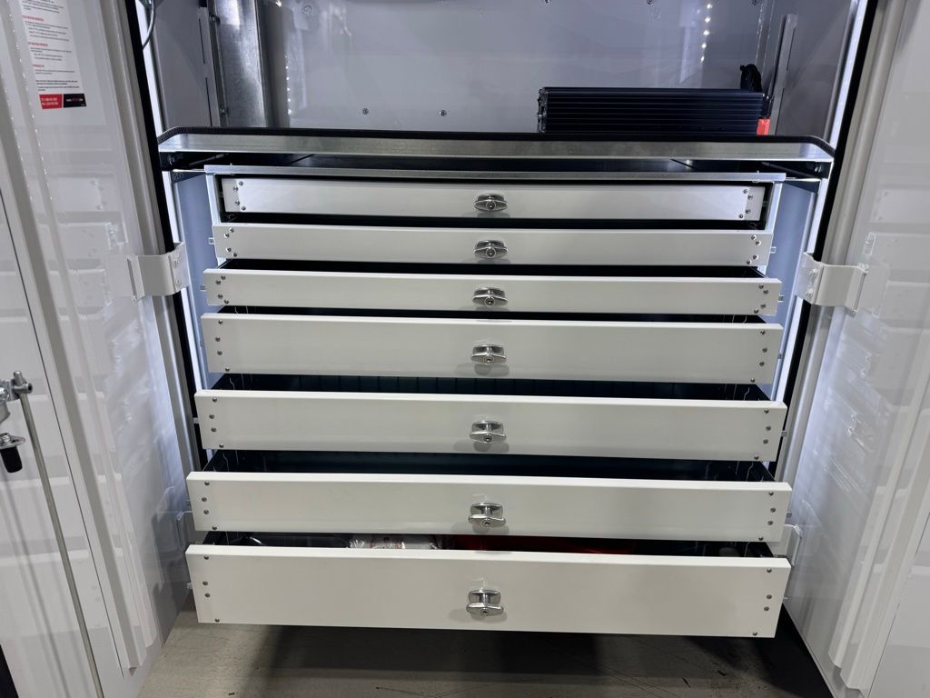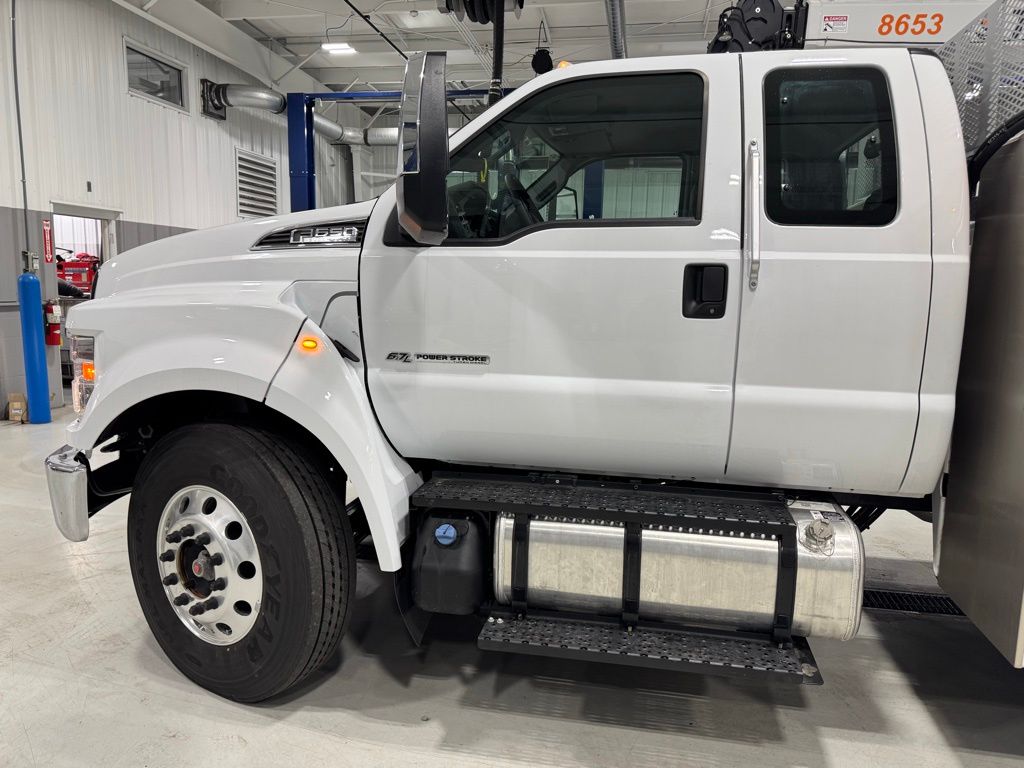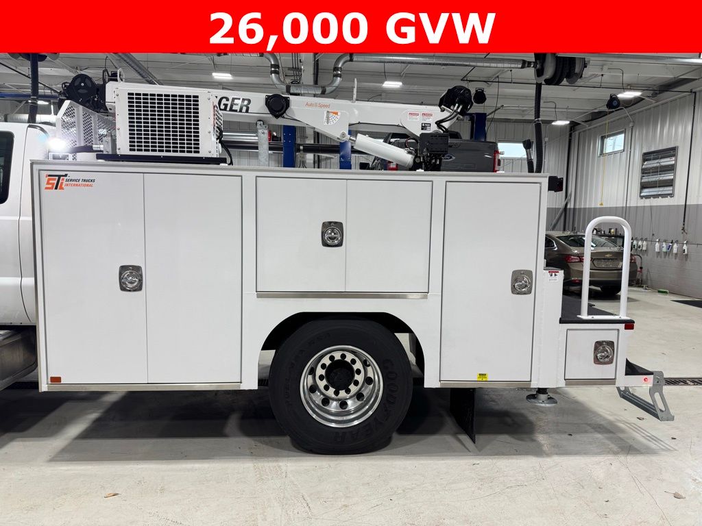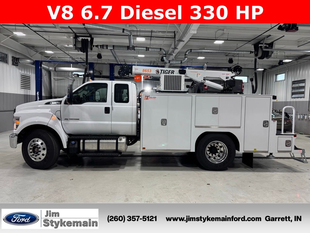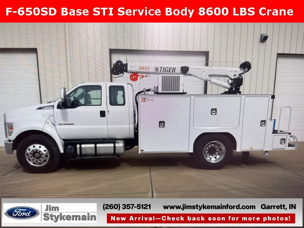 Oxford White 2026 Ford F-650SD STI Service Body 8600 LBS Crane RWD 10-Speed Automatic V8 6.7 Diesel 330 HP * DIESEL *, *Call 260-357-5121*, Air Brakes (FRONT DISC / REAR DRUM), 26,000 GVW, 2460 - 11 ft Work Ready, 84 CA, Series II 90k ft-lb Crane Body with 22" Workbench, 24" Deep x 60" Tall Cabinets, Full Hyd Extend and Up/Down Outriggers. Front CS Cabinet configured for O/A. Pressurized Cabinets., VMAC H40, Hydraulic Driven Screw Compressor with 25-40 cfm @ 150 PSI. Includes cold weather package. Requires 9 12 GPM. Minimum 5 gallon air reservoir., Model 8653 TIGER Hydraulic crane. 50k ft lb crane moment rating, 8,600 lbs capacity, 30.5' of hyd reach, 68 FPM no load single line winch speed, Auto II speed, Wireless joystick control with proportional trigger and LCD load display, Integrated filtration with visual bypass alert, 400 degree rotation, Anti-two-block, overload protection, notification horn and 33 ft tether cord. Cranes mounted on chassis will include a stability test report. Painted standard white. 2 year warranty., Inverter DC-AC, 1500W Pure Sine. Connects to chassis batteries., Alum, Super Cab, V8 6.7 Diesel 330 HP, 10-Speed Automatic, 110 A/C Outlet - in Lower Center Finish Panel, ABS brakes, Air Conditioning, AM/FM radio, Appearance Group, Body Builder Wiring - At Back of Cab, Combined, Chrome Grille Surround, Chromed Fender Badge, Electronic Stability Control, Engine Exhaust Brake, Exterior Appearance Group, Four Body Builder Switches - Mounted in Center Instrument Panel, Front Stabilizer Bar, Fully automatic headlights, Intelligent Oil Life Monitor, Lights - Roof Marker/Clearance - Amber Lenses, 5 Lights, Manual Regen Initiation - Driver Interface in Message Center, Power steering, Preferred Equipment Package 600A, Rapid-Heat Supplemental Cab Heater, Shock Absorbers, Rear - Double Acting, Speed control, Speed-Sensitive Wipers, Split folding rear seat, Steering Column - Tilt / Telescoping, Steering wheel mounted audio controls, Tachometer, Telescoping steering wheel, Tilt steering wheel, Traction control, Trip computer.